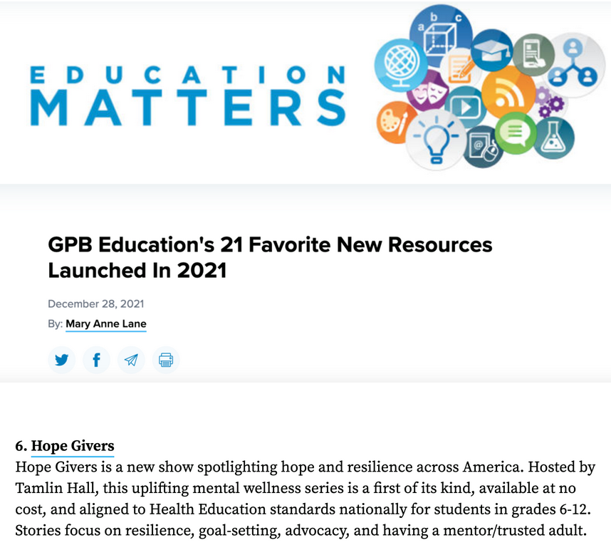We are thrilled to have Hope Givers named among Georgia Public Broadcasting Education’s 21 Favorite New Resources Launched in 2021 List.